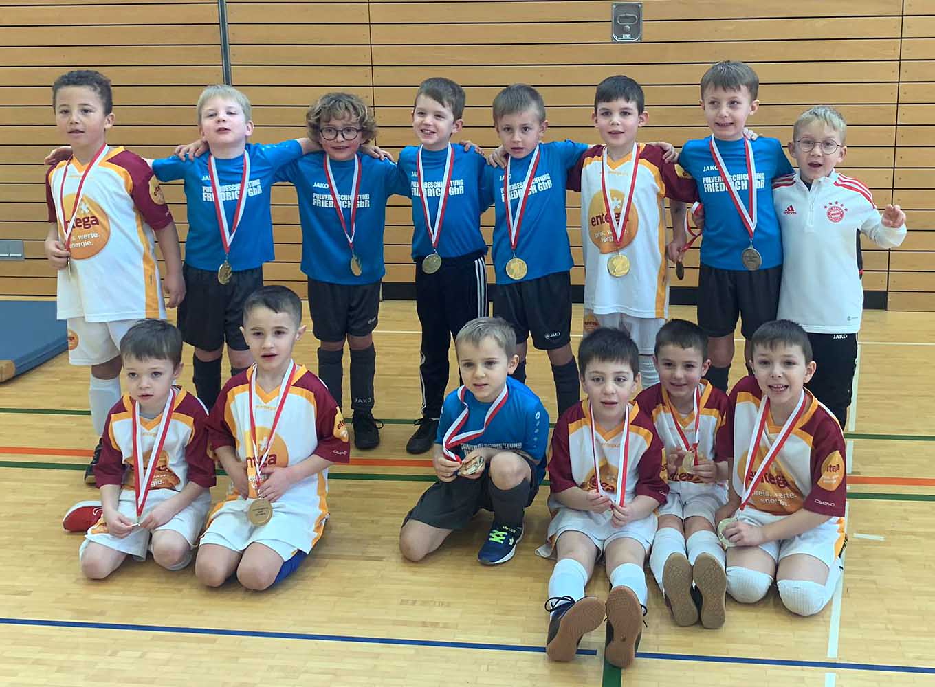 29.01.23. G-Jgd: Hallenturnier in Wörth. Gleich mit zwei Mannschaften trat man am vergangenen Sonntag beim Hallenturnier im benachbarten Wörth an. Die beiden Teams, die sich aus Kindern der Gemeinde Lützelbach zusammensetzen, waren, wie eigentlich immer, mit viel Begeisterung dabei. In diesem Alter (<=7 Jahre) spielt der sportliche Erfolg noch keine große Rolle, Ergebnisse sind zweitrangig, Hauptsache: Spiel, Spaß und Bewegung. Jedes Team hatte fünf Spiele zu absolvieren (G1: 2x S / 3x N, G2: 1x U / 4x N). Das Bild entstand nach der Medaillenverleihung und zeigt beide G-Jgd-Mannschaften.